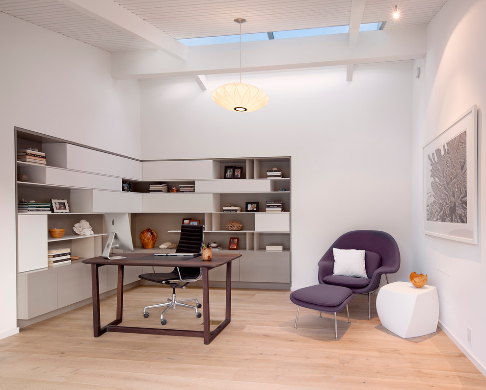 Mamy tutaj aranżację przestrzeni biurowej, ale zaaranżowanej bardzo przytulnie i „domowo”. Półki na dokumenty firmowe mają ciekawy układ, dzięki czemu wzbogacają tę przestrzeń i zamiast nudnej aranżacji biura mamy do czynienia z wnętrzem biurowym z charakterem. Usytuowanie półek za plecami osoby pracującej sprawia, że w trakcie pracy w skupieniu nad jednym zadaniem nie ma dodatkowych rozpraszaczy. Na biurku może się znajdować tylko to, co w danej chwili jest potrzebne, a pozostałe elementy są poukładane na odpowiednie półki, otwarte lub zamknięte.