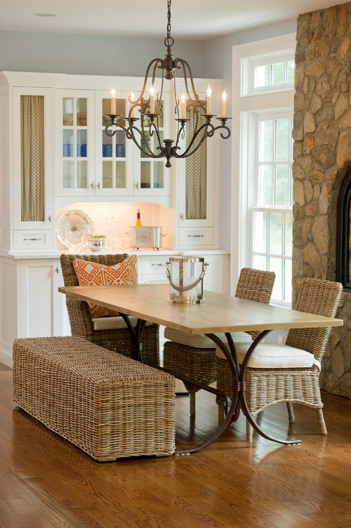 Jak widzicie, taki żyrandol będzie dobrze wyglądał również jako oświetlenie kuchenne – nad stół czy wyspę kuchenną. Dzięki dużej liczbie żarówek da mocne światło, a przy jasnym stole zdecydowanie milej spędza się czas. W kuchni z tego zdjęcia surowość żyrandola świetnie komponuje się z surowością kamienia na ścianie obok kominka i metalowymi nogami stołu. Przełamaniem tej surowości jest wiklina, z której zrobione są krzesła i ława stojące przy stole. Dzięki temu zachowana jest równowaga, a kuchnia wydaje się być doskonale przemyślana i zaplanowana w każdym, nawet najmniejszym, szczególe.