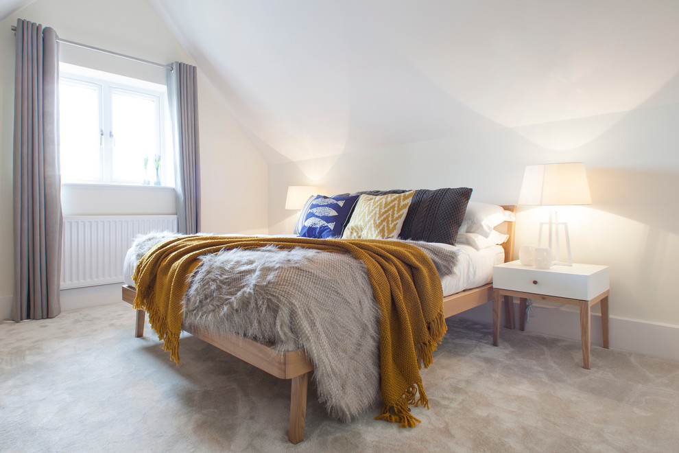 Wydawać by się mogło, że sypialnia w stylu skandynawskim jest spokojna i stonowana. Ale jednak już poduszki w kontrastowych barwach czy ozdobne zasłony mogą dodać jej nieco życia. Ja polecam również pokusić się o dekoracje ścienne, które uatrakcyjnią przestrzeń nad łóżkiem.