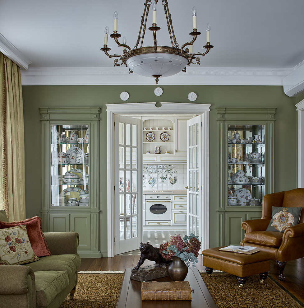 Teraz czas na salon w starym stylu. Tutaj zdecydowanie powinny się pojawić meble w dawnym stylu, bo bez nich wnętrze będzie pozbawione uroku. Warto postawić na solidne meble drewniane, klasyczne sofy na toczonych nóżkach czy elegancki stolik kawowy. Gdzieś z boku może się pojawić jakaż etażerka czy kredens, ale jakże inny od tego do kuchni. O ile we wnętrzach kuchennych dominowała biel i kredensy kuchenne malowano zwykle na biało, o tyle w salonie, czyli najbardziej reprezentacyjnym pomieszczeniu, kredens powinien być w kolorze drewna lub pomalowany na jakiś inny, raczej ciemny kolor. Pokój w dawnym stylu rzadko kiedy był bowiem biały, a zdecydowanie częściej miał jakąś nasyconą, stonowaną barwę. We wnętrzu, które chciałabym Wam pokazać jest to ładna butelkowa zieleń, która doskonale łączy się z brązem naturalnego drewna i skórzanego obicia fotela.